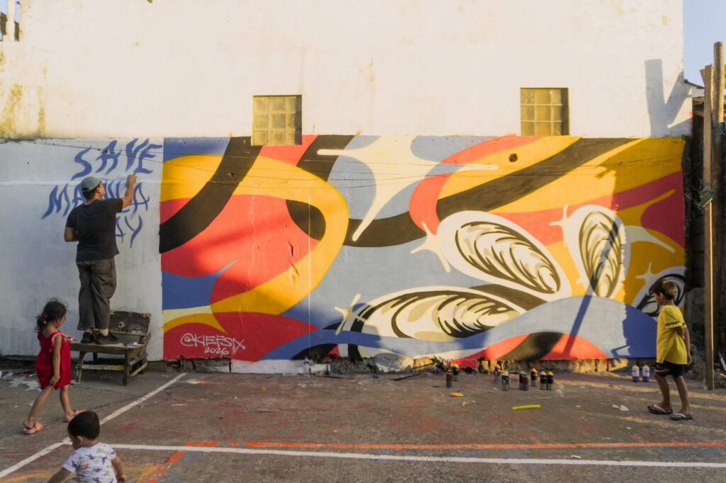 A mural is being created by young fisher folks
